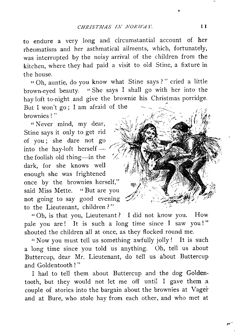 I had to tell them about Buttercup and the dog Goldentooth, but they would not let me off until I gave them a couple of stories into the bargain about the brownies at Vager and at Bure, who stole hay from each other, and who met at[Page 12] last with a load of hay on their backs, and how they fought till they vanished in a cloud of hay-dust. I had also to tell them the story of the brownie at Hesselberg, who teased the house-dog till the farmer came out and threw him over the barn bridge. The children clapped their hands in great joy and laughed heartily.