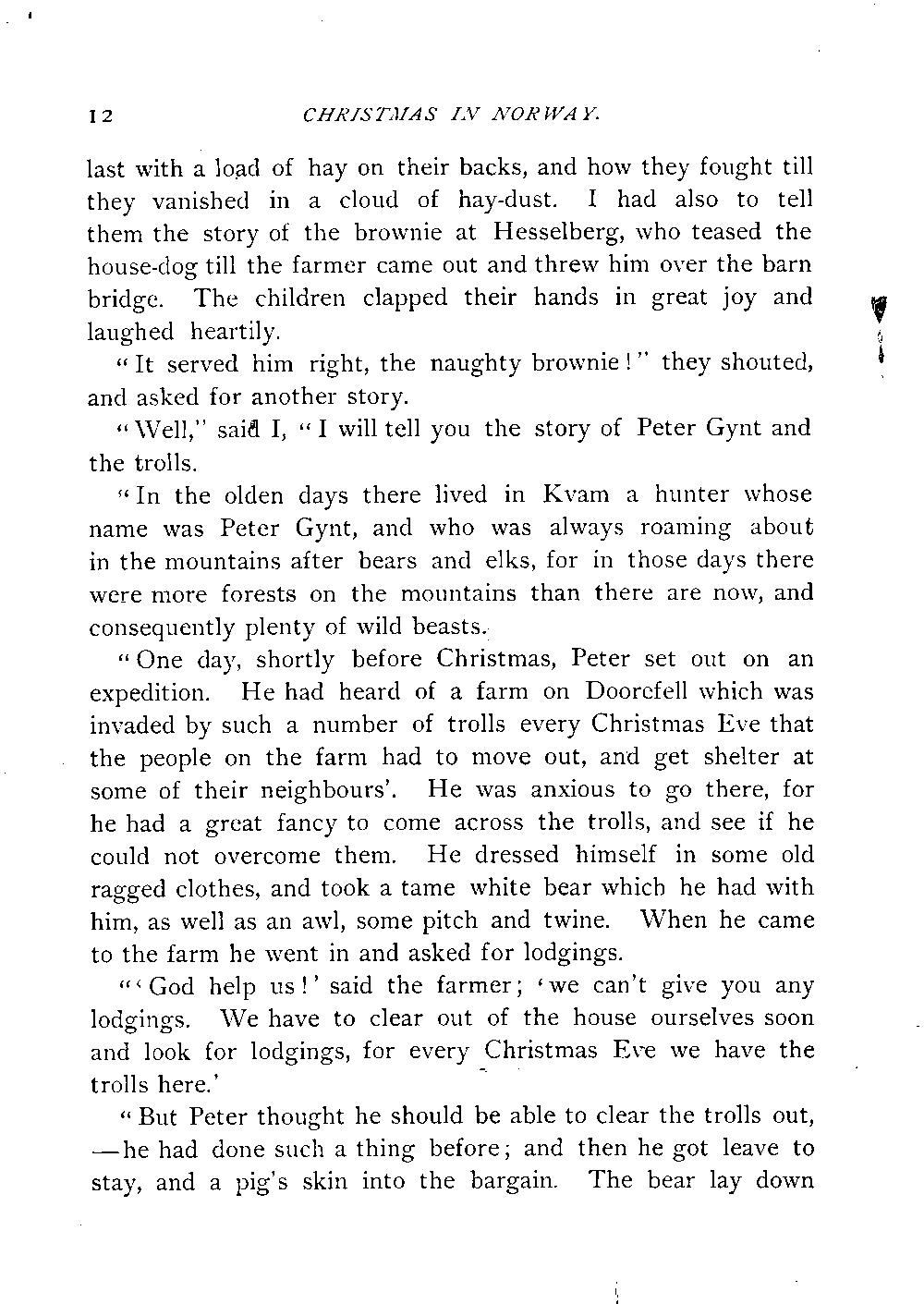 "One day, shortly before Christmas, Peter set out on an expedition. He had heard of a farm on Doorefell which was invaded by such a number of trolls every Christmas Eve that the people on the farm had to move out, and get shelter at some of their neighbours'. He was anxious to go there, for he had a great fancy to come across the trolls, and see if he could not overcome them. He dressed himself in some old ragged clothes, and took a tame white bear which he had with him, as well as an awl, some pitch and twine. When he came to the farm he went in and asked for lodgings.[Page 13]