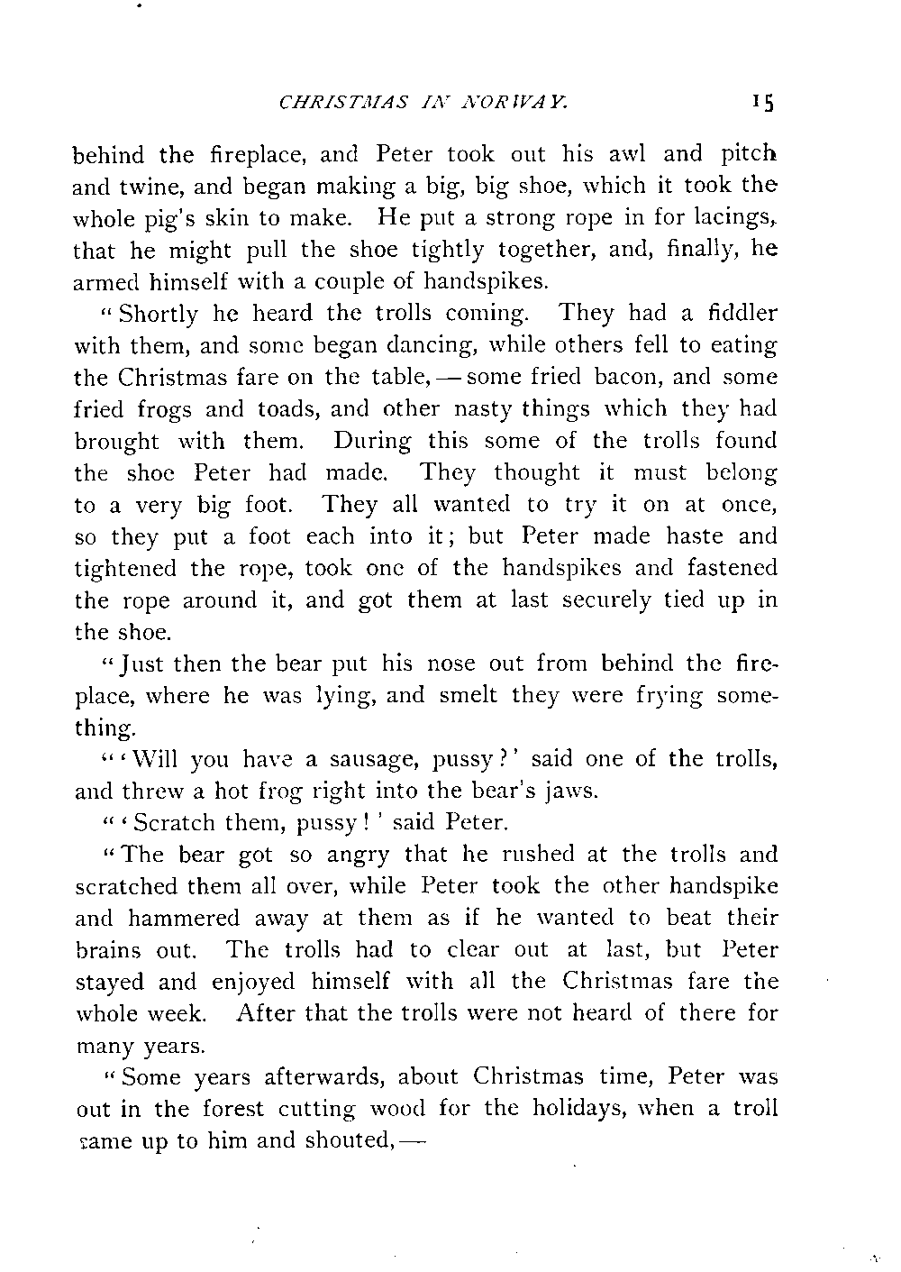 "The bear got so angry that he rushed at the trolls and scratched them all over, while Peter took the other handspike and hammered away at them as if he wanted to beat their brains out. The trolls had to clear out at last, but Peter stayed and enjoyed himself with all the Christmas fare the whole week. After that the trolls were not heard of there for many years.
