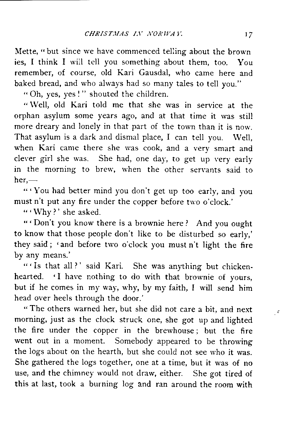 "I don't know exactly what I shall tell you," said Aunt[Page 17] Mette, "but since we have commenced telling about the brownies, I think I will tell you something about them, too. You remember, of course, old Kari Gausdal, who came here and baked bread, and who always had so many tales to tell you."