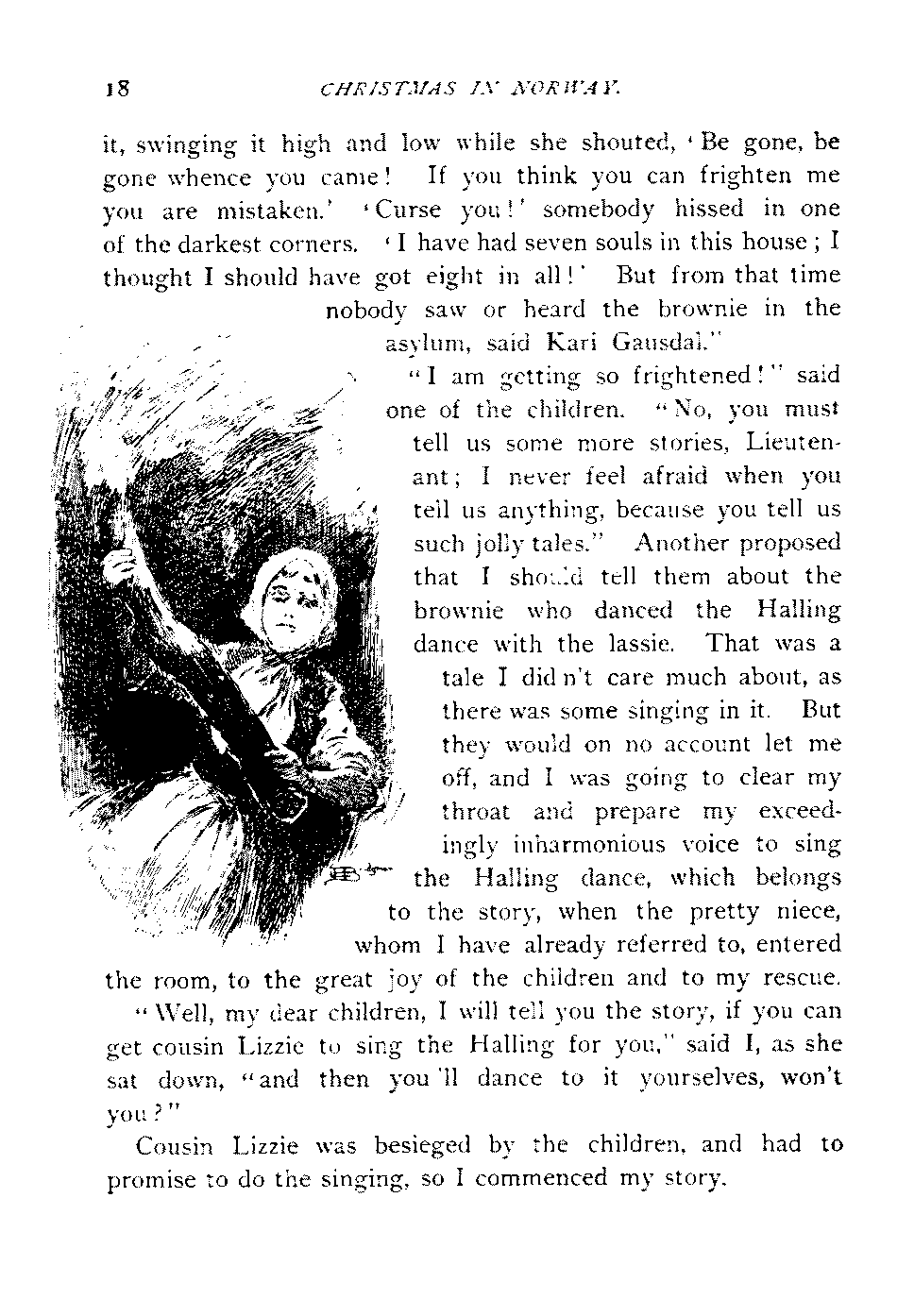 "I am getting so frightened!" said one of the children. "No, you must tell us some more stories, Lieutenant; I never feel afraid when you tell us anything, because you tell us such jolly tales." Another proposed that I should tell them about the brownie who danced the Halling dance with the lassie. That was a tale I didn't care much about, as there was some singing in it. But they would on no account let me off, and I was going to clear my throat and prepare my exceedingly inharmonious voice to sing the Halling dance, which belongs to the story, when the pretty niece, whom I have already referred to, entered the room, to the great joy of the children and to my rescue.