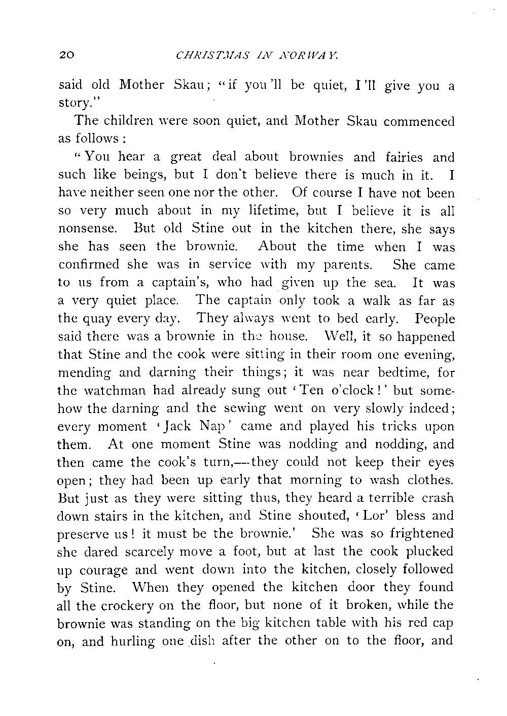 "You hear a great deal about brownies and fairies and such like beings, but I don't believe there is much in it. I have neither seen one nor the other. Of course I have not been so very much about in my lifetime, but I believe it is all nonsense. But old Stine out in the kitchen there, she says she has seen the brownie. About the time when I was confirmed she was in service with my parents. She came to us from a captain's, who had given up the sea. It was a very quiet place. The captain only took a walk as far as the quay every day. They always went to bed early. People said there was a brownie in the house. Well, it so happened that Stine and the cook were sitting in their room one evening, mending and darning their things; it was near bedtime, for the watchman had already sung out 'Ten o'clock!' but somehow the darning and the sewing went on very slowly indeed; every moment 'Jack Nap' came and played his tricks upon them. At one moment Stine was nodding and nodding, and then came the cook's turn,—they could not keep their eyes open; they had been up early that morning to wash clothes. But just as they were sitting thus, they heard a terrible crash down stairs in the kitchen, and Stine shouted, 'Lor' bless and preserve us! it must be the brownie.' She was so frightened she dared scarcely move a foot, but at last the cook plucked up courage and went down into the kitchen, closely followed[Page 21] by Stine. When they opened the kitchen door they found all the crockery on the floor, but none of it broken, while the[Page 22] brownie was standing on the big kitchen table with his red cap on, and hurling one dish after the other on to the floor, and[Page 23] laughing in great glee. The cook had heard that the brownies could sometimes be tricked into moving into another house when anybody would tell them of a very quiet place, and as she long had been wishing for an opportunity to play a trick upon this brownie, she took courage and spoke to him,—her voice was a little shaky at the time,—that he ought to remove to the tinman's over the way, where it was so very quiet and pleasant, because they always went to bed at nine o'clock every evening; which was true enough, as the cook told Stine later, but then the master and all his apprentices and journeymen were up every morning at three o'clock and hammered away and made a terrible noise all day. Since that day they have not seen the brownie any more at the captain's. He seemed to feel quite at home at the tinman's, although they were hammering and tapping away there all day; but people said that the gude-wife put a dish of porridge up in the garret for him every Thursday evening, and it's no wonder that they got on well[Page 24] and became rich when they had a brownie in the house. Stine believed he brought things to them. Whether it was the brownie or not who really helped them, I cannot say," said Mother Skau, in conclusion, and got a fit of coughing and choking after the exertion of telling this, for her, unusually long story.