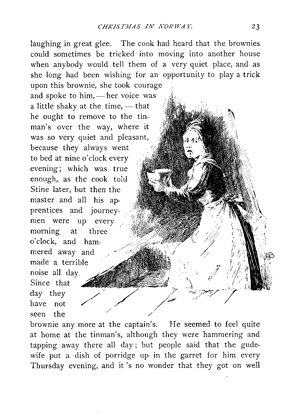 "There was, once upon a time,—I almost think it was in[Page 19] Hallingdal,—a lassie who was sent up into the hay-loft with the cream porridge for the brownie,—I cannot recollect if it was on a Thursday or on a Christmas Eve, but I think it was a Christmas Eve. Well, she thought it was a great pity to give the brownie such a dainty dish, so she ate the porridge herself, and the melted butter in the bargain, and went up into the hay-loft with the plain oatmeal porridge and sour milk, in a pig's trough instead. 'There, that's good enough for you, Master Brownie,' she said. But no sooner had she spoken the words than the brownie stood right before her, seized her round the waist, and danced about with her, which he kept up till she lay gasping for breath, and when the people came up into the hay-loft in the morning, she was more dead than alive. But as long as they danced, the brownie sang," (and here Cousin Lizzie undertook his part, and sang to the tune of the Halling)—
