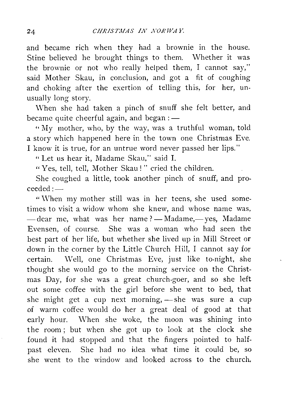 "When my mother still was in her teens, she used sometimes to visit a widow whom she knew, and whose name was,—dear me, what was her name?—Madame,—yes, Madame Evensen, of course. She was a woman who had seen the best part of her life, but whether she lived up in Mill Street or down in the corner by the Little Church Hill, I cannot say for certain. Well, one Christmas Eve, just like to-night, she thought she would go to the morning service on the Christmas Day, for she was a great church-goer, and so she left out some coffee with the girl before she went to bed, that she might get a cup next morning,—she was sure a cup of warm coffee would do her a great deal of good at that early hour. When she woke, the moon was shining into the room; but when she got up to look at the clock she found it had stopped and that the fingers pointed to half-past eleven. She had no idea what time it could be, so[Page 25] she went to the window and looked across to the church. The light was streaming out through all the windows. She must have overslept herself! She called the girl and told her to get the coffee ready, while she dressed herself. So she took her hymn-book and started for church. The street was very quiet; she did not meet a single person on her way to church. When she went inside, she sat down in her customary seat in one of the pews, but when she looked around her she thought that the people were so pale and so strange,—exactly as if they were all dead. She did not know any of them, but there were several of them she seemed to recollect having seen before; but when and where she had seen them she could not call to mind. When the minister came into the pulpit, she saw that he was not one of the ministers in the town, but a tall, pale man, whose face, however, she thought she could recollect. He preached very nicely indeed, and there was not the usual noisy coughing[Page 26] and hawking which you always hear at the morning services on a Christmas Day; it was so quiet, you could have heard a needle drop on the floor,—in fact, it was so quiet she began to feel quite uneasy and uncomfortable. When the singing commenced again, a female who sat next to her leant towards her and whispered in her ear, 'Throw the cloak loosely around you and go, because if you wait here till the service is over they will make short work of you. It is the dead who are keeping service.'"