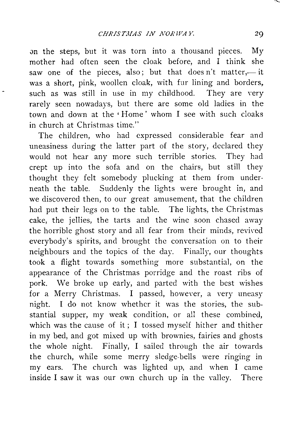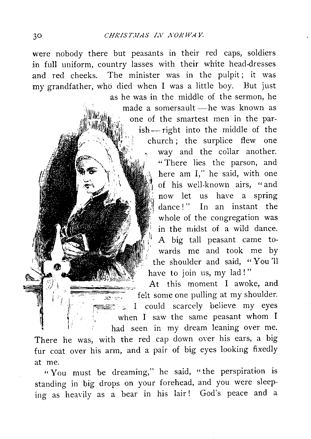 The children, who had expressed considerable fear and uneasiness during the latter part of the story, declared they would not hear any more such terrible stories. They had crept up into the sofa and on the chairs, but still they thought they felt somebody plucking at them from underneath the table. Suddenly the lights were brought in, and we discovered then, to our great amusement, that the children had put their legs on to the table. The lights, the Christmas cake, the jellies, the tarts and the wine soon chased away the horrible ghost story and all fear from their minds, revived everybody's spirits, and brought the conversation on to their neighbours and the topics of the day. Finally, our thoughts took a flight towards something more substantial, on the appearance of the Christmas porridge and the roast ribs of pork. We broke up early, and parted with the best wishes for a Merry Christmas. I passed, however, a very uneasy night. I do not know whether it was the stories, the substantial supper, my weak condition, or all these combined, which was the cause of it; I tossed myself hither and thither in my bed, and got mixed up with brownies, fairies and ghosts the whole night. Finally, I sailed through the air towards the church, while some merry sledge-bells were ringing in my ears. The church was lighted up, and when I came inside I saw it was our own church up in the valley. There[Page 30] were nobody there but peasants in their red caps, soldiers in full uniform, country lasses with their white head-dresses and red cheeks. The minister was in the pulpit; it was my grandfather, who died when I was a little boy. But just as he was in the middle of the sermon, he made a somersault—he was known as one of the smartest men in the parish—right into the middle of the church; the surplice flew one way and the collar another. "There lies the parson, and here am I," he said, with one of his well-known airs, "and now let us have a spring dance!" In an instant the whole of the congregation was in the midst of a wild dance. A big tall peasant came towards me and took me by the shoulder and said, "You'll have to join us, my lad!"