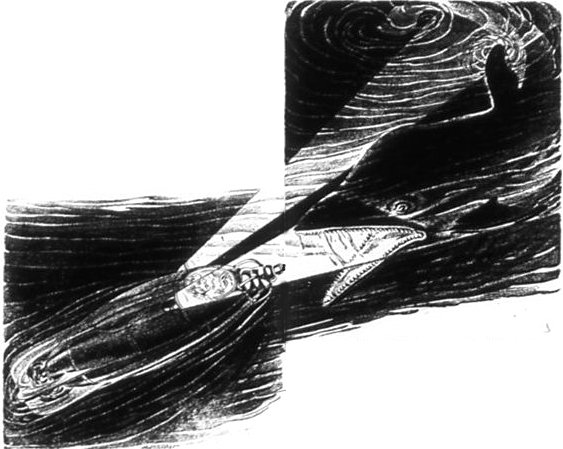 For a moment he was unable to move. Such a mode of attack was totally unexpected, and the sight held him fascinated. He could see the very wrinkles of the monster's skin as it rushed in, with shadowy flukes thrusting behind; could see the lines of dagger-like teeth, the cavernous maw and gullet. And then all vision was blotted out as the jaws closed around the torpoon's nose.