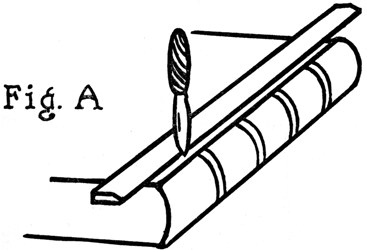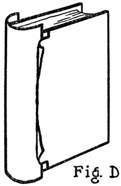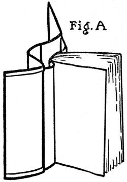 To do this, cut a strip of medium weight Japan vellum—which is the best paper for the purpose—a few inches more than twice the height of the book and in width equal to the inside back. One end of this, with the corners clipped so it will not catch, is inserted between the outside and inside backs of the book and slipped through[Pg 21] until it projects about an inch at the bottom of the book. (Fig. A.) The part of the strip left exposed at the top is then well coated on the inside face with the paste mentioned above and pulled into the book, against the inside back or lining, by means of the end projecting at the bottom. The surplus of the strip at top and bottom is then cut off, two short slips of paper temporarily inserted at top and bottom to prevent the new lining adhering to the outside back, and a firm hand pressure applied all over the back to force the new lining into close union with the old on the backs of the signatures. The book is then set[Pg 22] aside to dry, under a light pressure, after which the two slips of paper inserted at top and bottom are pulled out.