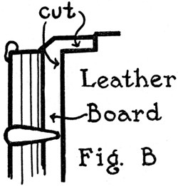 After the leather of the old book to be rebacked has been treated, a cut is made down each side of the back, through the leather close to the broken hinge. (Fig. A.) Care should be taken not to cut through the cords which[Pg 41] are set into the boards at this point. If the back is furnished with a leather label in a fair state of preservation, this label should be cut around and lifted off to be used again on the new back.