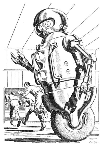 "I'll take the servomechs, Bert," piped Gaines, tramping clumsily toward the nearest of the gyro-balanced single-wheeled robots.
