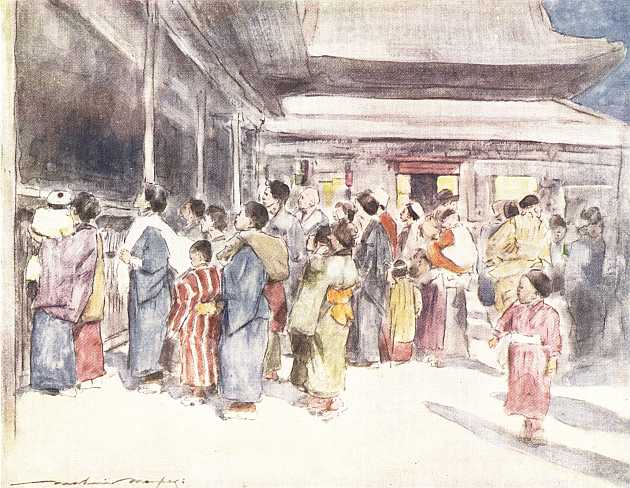 After that night Inchie became my constant companion and friend. Wherever I went he came. Whether it was to theatres, neighbouring towns, metal-workers or fan-workers, Inchie always accompanied me, until in the end it became a daily habit for him to drift about with me in the sunshine, neglecting his business entirely. For Inchie was an artist first and a merchant after. We visited the temples, where Inchie taught me to appreciate the difference between a degenerate Buddha and a perfect Buddha, a difference so subtle as to be quite indistinguishable to the alien. Gradually, bit by 158 bit, as I grew to know him better, this little merchant’s true nature revealed itself to me. I began to see the man apart from the merchant, and he proved himself to be a great artist. Here in England we should call him a distinguished genius, and undoubtedly there are scores of equally brilliant men in Japan.