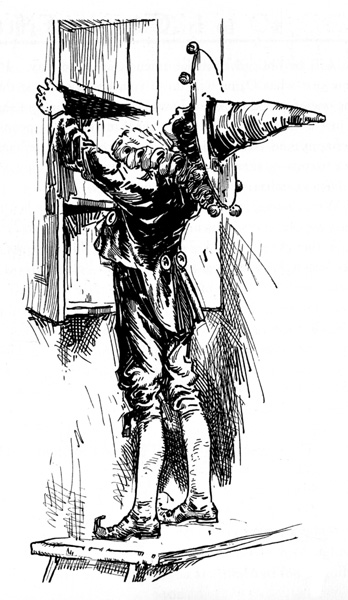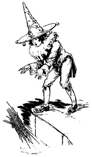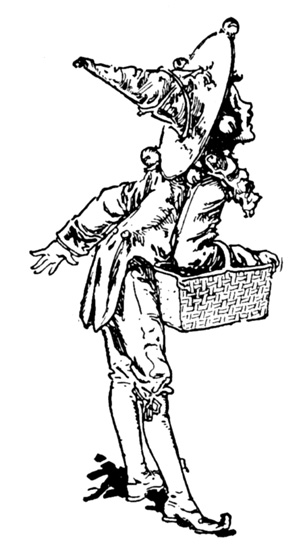 Ojo dressed. He wore blue silk stockings, blue knee-pants with gold buckles, a blue ruffled waist and a jacket of bright blue braided with gold. His shoes were of blue leather and turned up at the toes, which were pointed. His hat had a peaked crown and a flat brim, and around the brim was a row of tiny golden bells that tinkled when he moved. This was the native costume of those who inhabited the Munchkin Country of the Land of Oz, so Unc Nunkie's dress was much like that of his nephew. Instead of shoes, the old man wore boots24 with turnover tops and his blue coat had wide cuffs of gold braid.