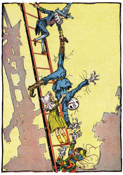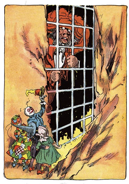 First thing—bang! And an earthquake drops Dorothy and Zeb, her boy companion, through the earth's crust plumb into the Glass City. Here they soon meet the Wonderful Wizard of Oz, who also has fallen into this remarkable town. In company with Jim, the Cab Horse, Eureka, the Discontented Kitten, and the Nine Tiny Piglets, Dorothy and her friends are condemned to die, but escape into a tunnel through which they pass into the Valley of Voices. In their efforts to reach either the surface of the earth or the Land of Oz, where they would be helped by the powerful Princess Ozma, they meet many dangers and have numerous startling encounters with strange beings. Finally they are rescued by Ozma and are safe in the Emerald City. Here there is a great reunion, attended by the Tin Woodman, the Scarecrow, the Cowardly Lion, the Hungry Tiger and many other of our old friends of Oz.