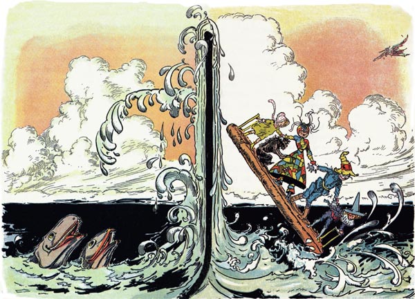 There is a frightful storm at sea, during which Dorothy and Billina, the Yellow Hen, are cast ashore. Here, after escaping the Wheelers, they come across the mechanical man, Tiktok, and the three proceed through the Land of Ev to the palace of a wicked princess, where they are all imprisoned. They are rescued by Ozma, the Cowardly Lion, the Hungry Tiger, the Scarecrow and the Tin Woodman. All then proceed to the realm of the Nome King to effect the release of the Royal Family of Ev, who have been enchanted by that cross old monarch. This done, after many trials and difficulties, the adventurers return to the Emerald City, where at a great feast the Hungry Tiger loses his appetite!