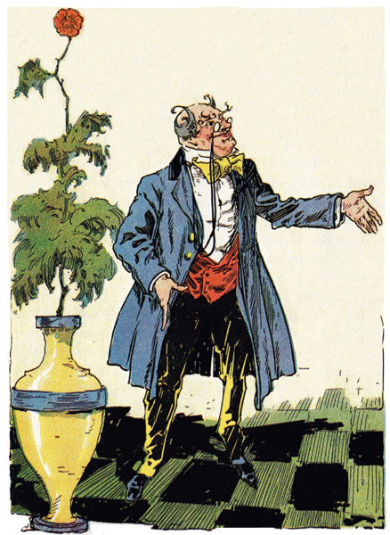 It was a big house, round, as were all the Munchkin houses, and painted blue, which is the distinctive color of the Munchkin Country of Oz. There was a pretty garden around the house, where blue trees and blue flowers grew in abundance and in one place were beds of blue cabbages, blue carrots and blue lettuce, all of which were delicious to eat. In Dr. Pipt's garden grew bun-trees, cake-trees, cream-puff bushes, blue buttercups which yielded excellent blue butter and a row of chocolate-caramel plants. Paths of blue gravel divided the vegetable and flower beds and a wider path led up to the front door. The place was in a clearing on the mountain, but a little way off was the grim forest, which completely surrounded it.