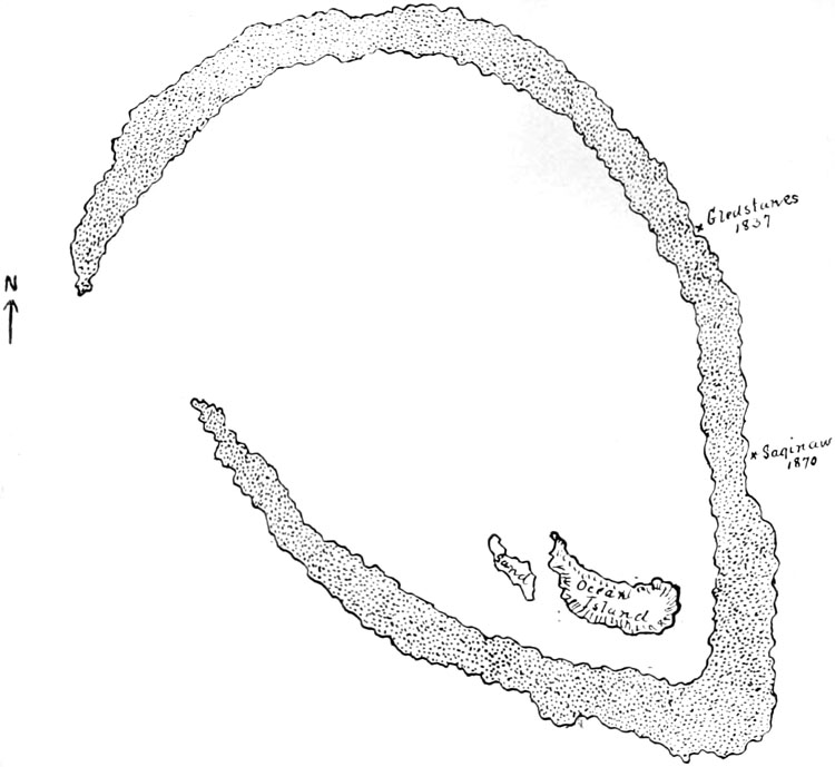 Ocean Island is about fifty miles to the westward of the Midway Islands, is of similar formation, and is the last one (so far as our chart shows) in the chain of ocean dangers that I have referred to as extending more than a thousand miles to the westward from the Sandwich Islands. It was on this reef that the British ship Gledstanes was wrecked in 1837, and the American ship Parker in September, 1842, the crew of the latter vessel remaining there until May, 1843, when they were taken off.