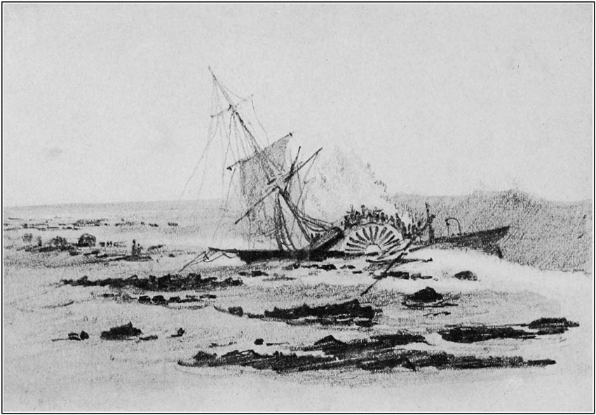 The captain had immediately followed his orders, to take in the sails that were forging us on towards the reef, by an order to back engines. Alas! the steam was too low to give more than a few turns to the wheels, and they could not overcome the momentum of the ship. In less than an hour of the fierce pounding the jagged rock broke through the hull and tore up the engine and fire room floor; the water rushed in and reached the fires; the doom of our good ship was now apparent and sealed.