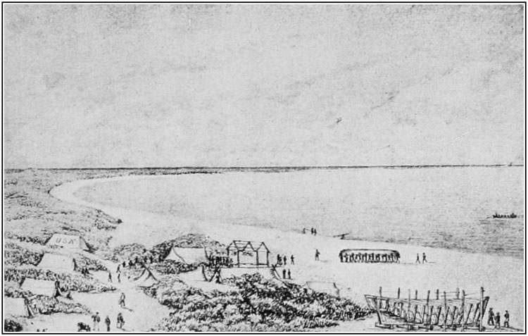 With fourteen hours of severe labor, tired, wet, and hungry, we were yet glad enough to sink to rest amid the bushes with but the sky for a canopy and a hummock of sand for a pillow. In my own case sleep was hard to win. For a long time I lay watching the stars and speculating upon the prospects of release from our island prison. Life seemed to reach dimly uncertain into the future, with shadow pictures intervening of famished men and bereaved families.
