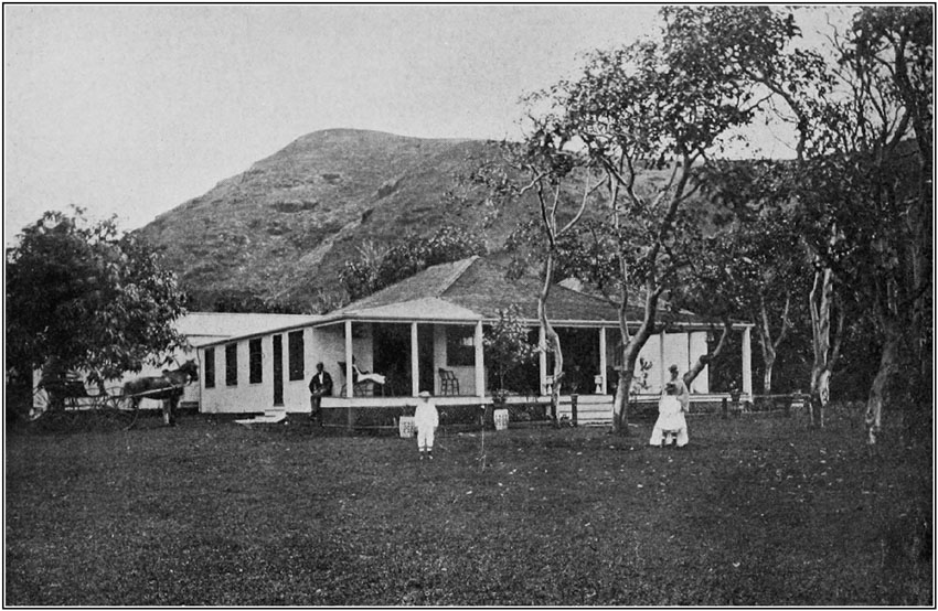 Honolulu, January 28, 1871. Perhaps some reader may deem the story of the Saginaw's last cruise complete. I cannot, however, consider it so while lacking the sorrowful story of our comrades' voyage in the gig, with its fatal ending as told by Halford, the sole survivor. Nor would it be less than ingratitude to pass unnoticed the fact of our hearty reception when we arrived here on the fourteenth, well fed and well clothed through the generous exertions of our friends. The King, his Cabinet, and most of the population were on the wharves as the Kilauea steamed into the harbor. The cheers and hat-waving were but the prelude to a most cordial and affectionate greeting when we landed in the [97]midst of the throng. Several of the officers were at once seized upon and taken to the homes of their old-time friends. When I could elude the crowd I was whisked away in a carriage to the Nuuanu Valley home of Mr. John Paty, and there rested in luxury and comfort until to-day, when we are to sail on the steamer Moses Taylor. In recognition of his great kindness as well as to illustrate the comfortable style of the island homes, I insert a picture of Mr. Paty's bungalow.