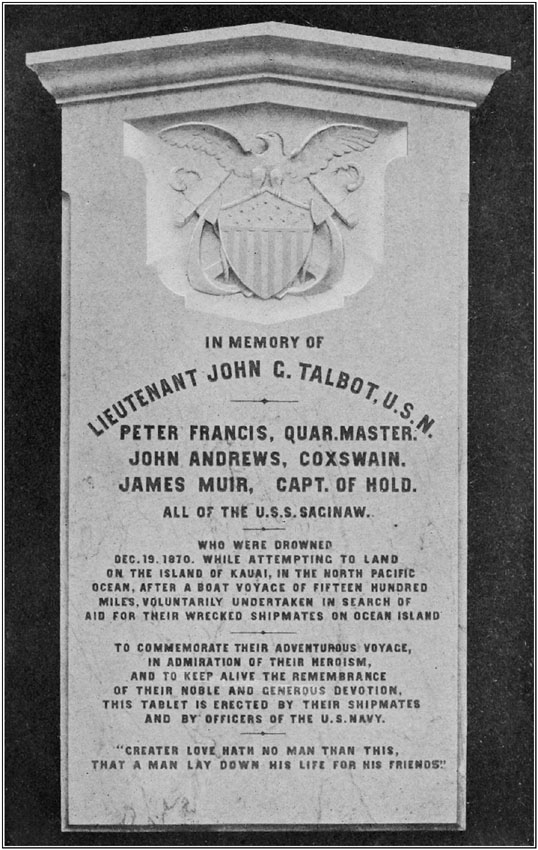 San Francisco, February 8, 1871. After a pleasant voyage in the Moses Taylor we are again, all hands,—minus our gallant comrades,—on American soil, and the cruise of the Saginaw is officially closed. The officers have taken up quarters on shore, and the crew [119]temporarily transferred to the U.S. Steamer Saranac for discharge or detail as their period of enlistment may require. The gig came with us and will be temporarily stored until it is decided as to her future. We have started a subscription for a suitable memorial to the gig's heroes, and the other ships of the squadron have generously offered their help. The most approved plan seems to be a marble tablet on the walls of the chapel at the Naval Academy, and the captain has made a sketch of one as it would appear there.