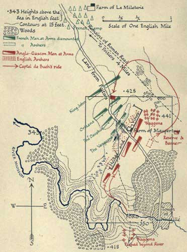 That he intended any such action we may doubt in the light of what followed. It was certainly not to his advantage to do so. The French by occupying Poitiers had left his way to the south free, but the extreme weariness of his force and the possibility that the French might strike suddenly were both present in his mind. He wisely prepared for either alternative of action or retreat, and carefully prepared the position he had chosen. For its exact nature, I must refer my reader to the next section, but the general conditions of the place are proper to the interest of our present matter.