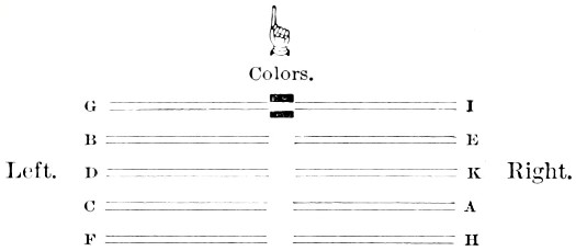 In the execution of this order Companies I and G, with the color guard, continued marching straight ahead at the ordinary step, just as if no order had[Pg 12] been given. The men of Co’s F, C, D and B turned to their left and ran east—toward Sam Poffenberger’s Co’s H, A, K and E turned to the right and ran west—toward the Smoketown road. As fast as the respective companies “uncovered,” they came to “Front” and advanced to the front, still running. In other words, after Co. B had run east and Co. E west, the length of their company, each man turned to the front (or the woods) and the company ran till B was left of G, and E was right of I, which being done B and E quit running and took up the ordinary step. It will be seen that D had twice as far to run to the east, and K twice as far to the west, and that C and A ran three times, and F and H four times as far as B and E had done.