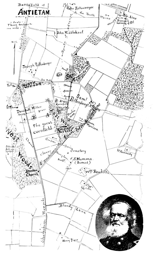[4] The map does not show this new or “Keedysville road.” It now runs directly past Michael Miller’s gate to Sam Poffenberger’s, thence up Sam’s old lane to the woods, there turning west enters the Smoketown road, where the right of the 10th Maine fought—near M on the map. The lane from M. Miller’s to Morrison’s has been closed, and also that part of Sam’s lane which was in East Woods.