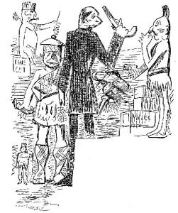 Mr. Spout adopted the resolution unanimously, and by a further singular coincidence, they lighted their segars, and left the place for a promenade. A brisk rain beginning to fall, they sheltered themselves under an awning. A pair of gold spectacles containing a tall, sharp featured man, adorned with[Pg 19] an unshaven face and a brigandish hat, approached them, and asked Mr. Spout for a light. Mr. Spout acquiesced. The party in attempting to return the cigar, accidentally touched the lighted end to Mr. Spout's hand, and not only burned his hand slightly, but knocked the cigar out of the fingers of third party; whereupon, Mr. Spout extemporized a moderate swear. Third party apologized, and offered a cigar to Spout and Van Dam from his own cigar-case, which they accepted; and he hoped that in their future acquaintance, should they feel disposed to continue it, he would not again involuntarily burn their fingers. He announced himself to be Mr. Remington Dropper, a two years' importation from Cincinnati, and a book-keeper in the heavy hardware house of Steel, Banger & Co., down town.