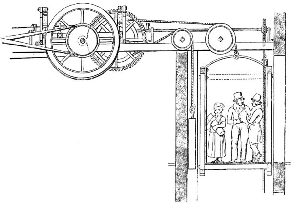 [3] A type of elevator known as the “teagle” was in use in some multistory English factories by about 1835. From its description, this elevator appears to have been primarily for the use of passengers, but it unquestionably carried freight as well. The machine shown in figure 7 had, with the exception of a car safety, all the features of later systems driven from line shafting—counterweight, control from the car, and reversal by straight and crossed belts.