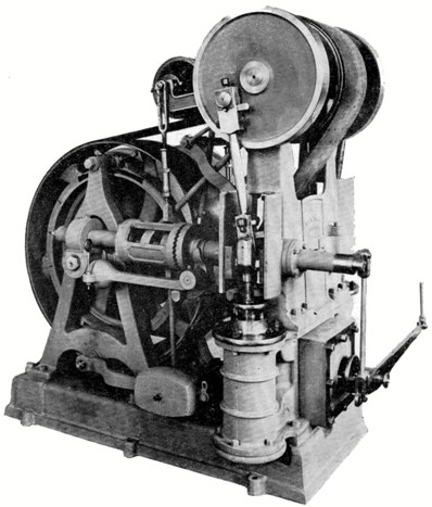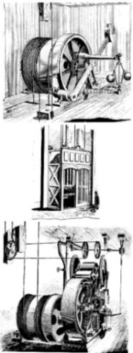 Since the only practical way in which the power of a steam engine could be applied to the haulage of elevator cables was through a rotational system, the[Pg 10] cables invariably were wound on a drum. The travel or rise of the car was therefore limited by the cable capacity of the winding drum. As building heights increased, drums became necessarily longer and larger until they grew so cumbersome as to impose a serious limitation upon further upward growth. A drum machine rarely could be used for a lift of more than 150 feet.[5]