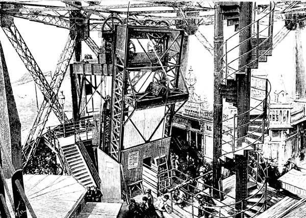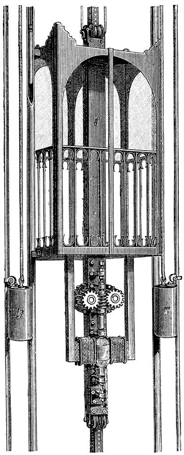 Second to the interest shown in the tower’s structural aspects was the interest in its mechanical organs. Of these, the most exceptional were the three separate elevator systems by which the upper levels were made accessible to the Exposition visitors. The design of these systems involved problems far greater than had been encountered in previous elevator work anywhere in the world. The basis of these difficulties was the amplification of the two conditions that were the normal determinants in elevator design—passenger capacity and height of rise. In addition, there was the problem, totally new, of fitting elevator shafts to the curvature of the Tower’s legs. The study of the various solutions to these problems presents a concise view of the capabilities of the elevator art just prior to the beginning of the most recent phase of its development, marked by the entry of electricity into the field.
