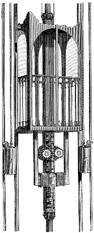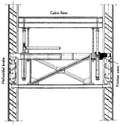 As in the other systems, safety was a matter of prime importance. In this case, the element of risk lay in the possibility of the suspended car falling. The upper car, resting on the rams, was virtually free of such danger. Here again the influence of Backmann was felt—a brake of his design was applied (fig. 38). It was, true to form, a throwback, similar safety devices having proven unsuccessful much earlier. Attached to the lower car were two helically threaded vertical[Pg 36] rollers, working within the hollow guides. Corresponding helical ribs in the guides rotated the rollers as the car moved. If the car speed exceeded a set limit, the increased resistance offered by the apparatus drove the rollers up into friction cups, slowing or stopping the car.
