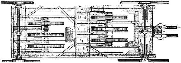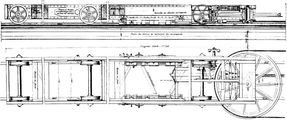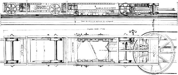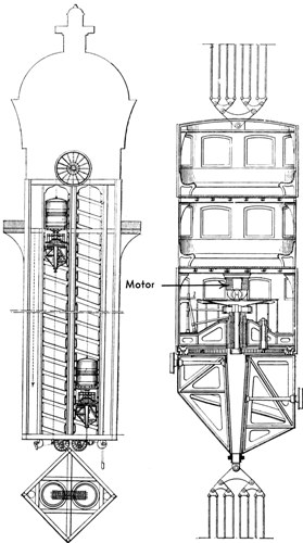 | Figure 37.—Schematic diagram of the Edoux system. (Adapted from Gustave Eiffel, La Tour de Trois Cents Mètres, Paris, 1900, p. 175.) | Figure 38.—Vertical section through lower (suspended) Edoux car, showing Backmann helicoidal safety brake. (Adapted from Gustave Eiffel, La Tour Eiffel en 1900, Paris, 1902, p. 12.) |