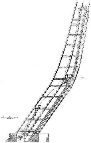 During the previously mentioned studies of high piers undertaken by the Eiffel firm, it was established that as the base width of these piers increased in proportion to their height, the diagonal bracing connecting the vertical members, necessary for rigidity, became so long as to be subject to high flexural stresses from wind and columnar loading. To resist these stresses, the bracing required extremely large sections which greatly increased the surface of the structure exposed to the wind, and was, moreover, decidedly uneconomical. To overcome this difficulty, the principle which became the basic design concept of the Tower was developed.
