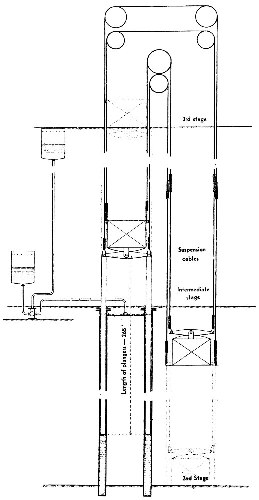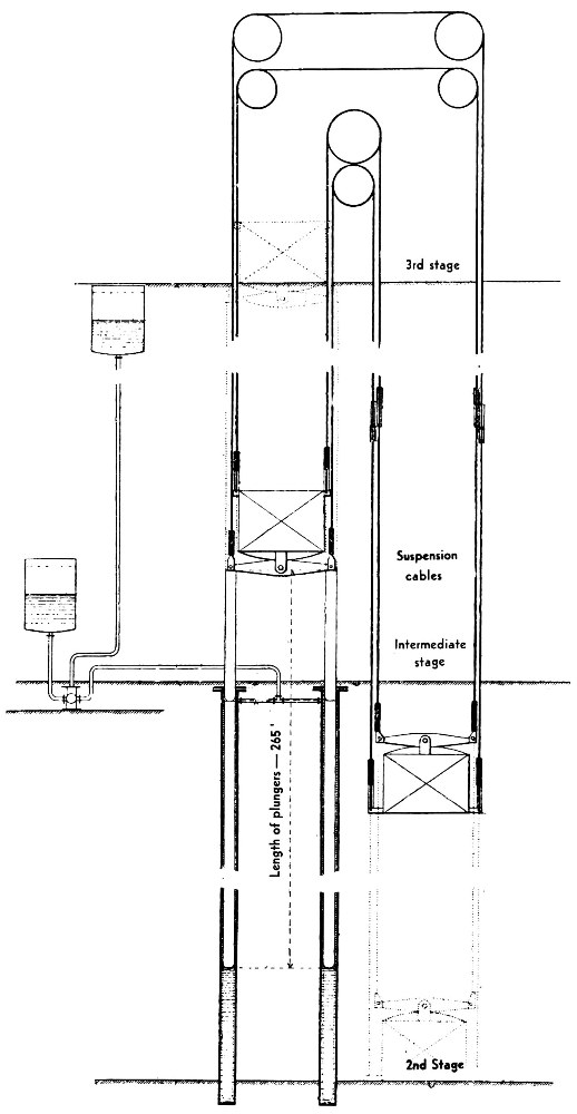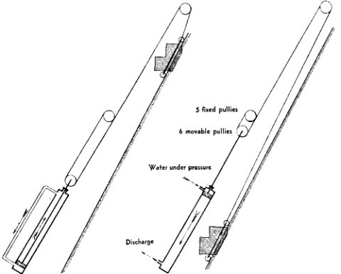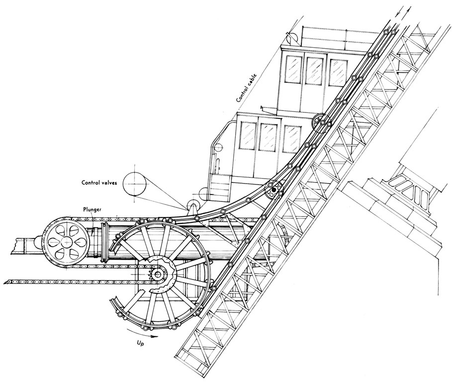 In operation, water was admitted to the two cylinders from a tank on the third platform. The resultant hydraulic head was sufficient to force out the rams and raise the upper car. As the rams and car rose, the rising water level in the cylinders caused a progressive reduction of the available head. This negative effect was further heightened by the fact that, as the rams moved upward, less and less of their length was buoyed by the water within the cylinders, increasing their effective weight. These two factors were, however, exactly compensated for by the lengthening of the cables on the other side of the pulleys as the lower car descended. Perfect balance of the system’s dead load for any position of the cabins was, therefore, a quality inherent in its design. However, there were two extreme conditions of live loading which required consideration: the lower car full and the upper empty, or vice versa. To permit the upper car to descend under the first condition, the plungers were made sufficiently heavy, by the addition of cast iron at their lower ends, to overbalance the weight of a capacity load in the lower car. The second condition demanded simply that the system be powerful enough to lift the unbalanced weight of the plungers plus the weight of passengers in the upper car.
