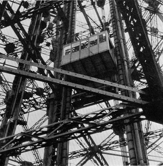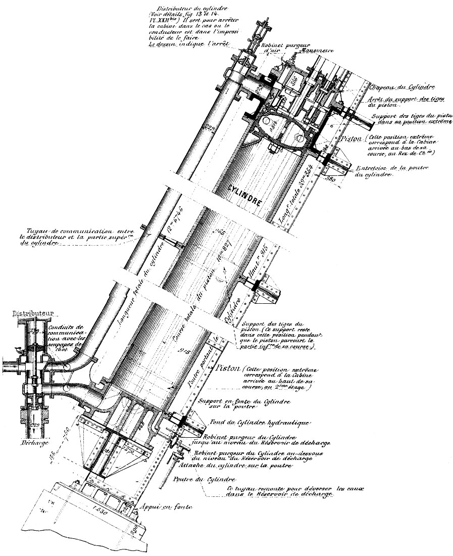 Today the two Fives-Lilles hydraulic systems remain in full use; and visitors reach the Tower’s summit by Edoux’s elevator (fig. 41), which is all that remains of the original installation.