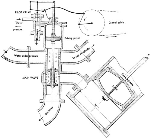 The system was not basically different from the simple hydraulic press so well known at the time. Water, admitted to a horizontal cylinder, displaced a piston and rod to which a sheave was attached. Around the sheave passed a loop of chain, one end of which was fixed, the other running over guide sheaves and terminating at the crane arm with a lifting hook. As the piston was pressed into the cylinder, the free end of the chain was drawn up at triple the piston speed, raising the load. The effect was simply that [Pg 11]of a 3-to-1 tackle, with the effort and load elements reversed. Simple valves controlled admission and exhaust of the water. (See fig. 11.)