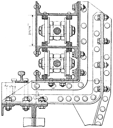 | Figure 35.—Detail of links in the Roux system. (From Gustave Eiffel, La Tour de Trois Cents Mètres, Paris, 1900, p. 156.) | Figure 36.—Section of guide trunks in the Roux system. (From Gustave Eiffel, La Tour de Trois Cents Mètres, Paris, 1900, p. 156.) |