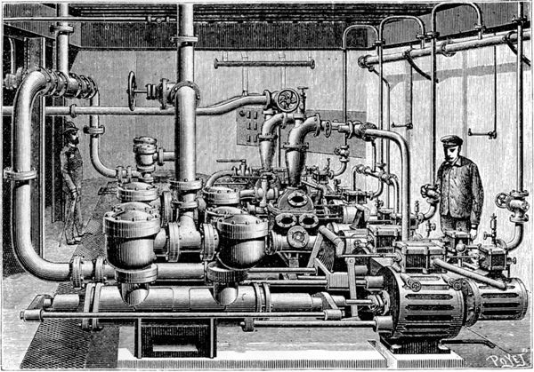 A curiosity in connection with the Edoux system was the use of Worthington (American) pumps (fig. 40) to carry the water exhausted from the cylinders back to the supply tanks. No record has been found that might explain why this particular exception was made to the “foreign materials” stipulation. This exception is even more strange in view of Otis’ futile request for the same pumps and the fact that any number of native machines must have been available. It is possible that Edoux’s personal influence was sufficient to overcome the authority of the regulation.