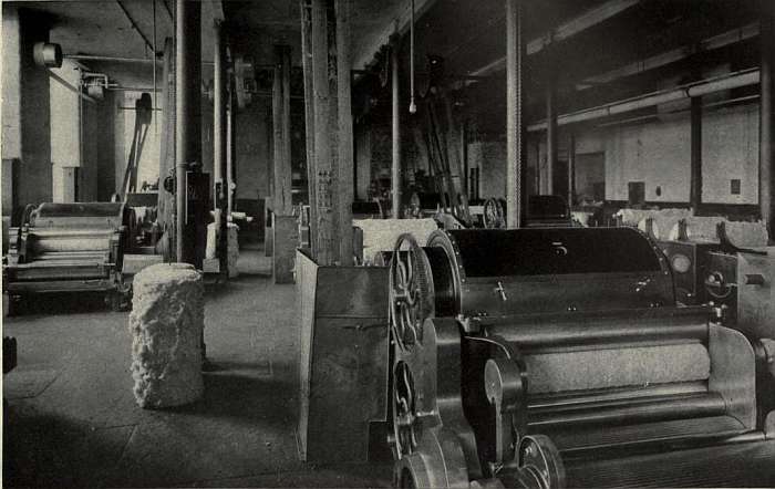 A bale breaker is used to disentangle fibres which have been, by hydraulic or steam presses, converted into hard masses that resist manual efforts to disentangle them. It may consist of three pairs of spiked and one pair of fluted rollers. If so, the matted cotton is fed into the first pair, seized by the second pair, which have a higher surface velocity, and pulled, while the third pair reduce the whole to a more or less fluffy mass, and the fluted rollers deliver it upon a travelling lattice by which it is conveyed to, and deposited upon, the floor of the mixing room. Instead of rollers, a hopper breaker may be used. In this machine the cotton is carried by a horizontal lattice into contact with a sloping spiked one, whose spikes tear away small tufts and deposit them upon a second lattice for removal to the mixing room. A stack of pulled cotton is formed by superposing thin layers from different bales, and when completed the cotton is drawn from top to bottom of the stack. By this means a thorough mixing of fibres is effected.