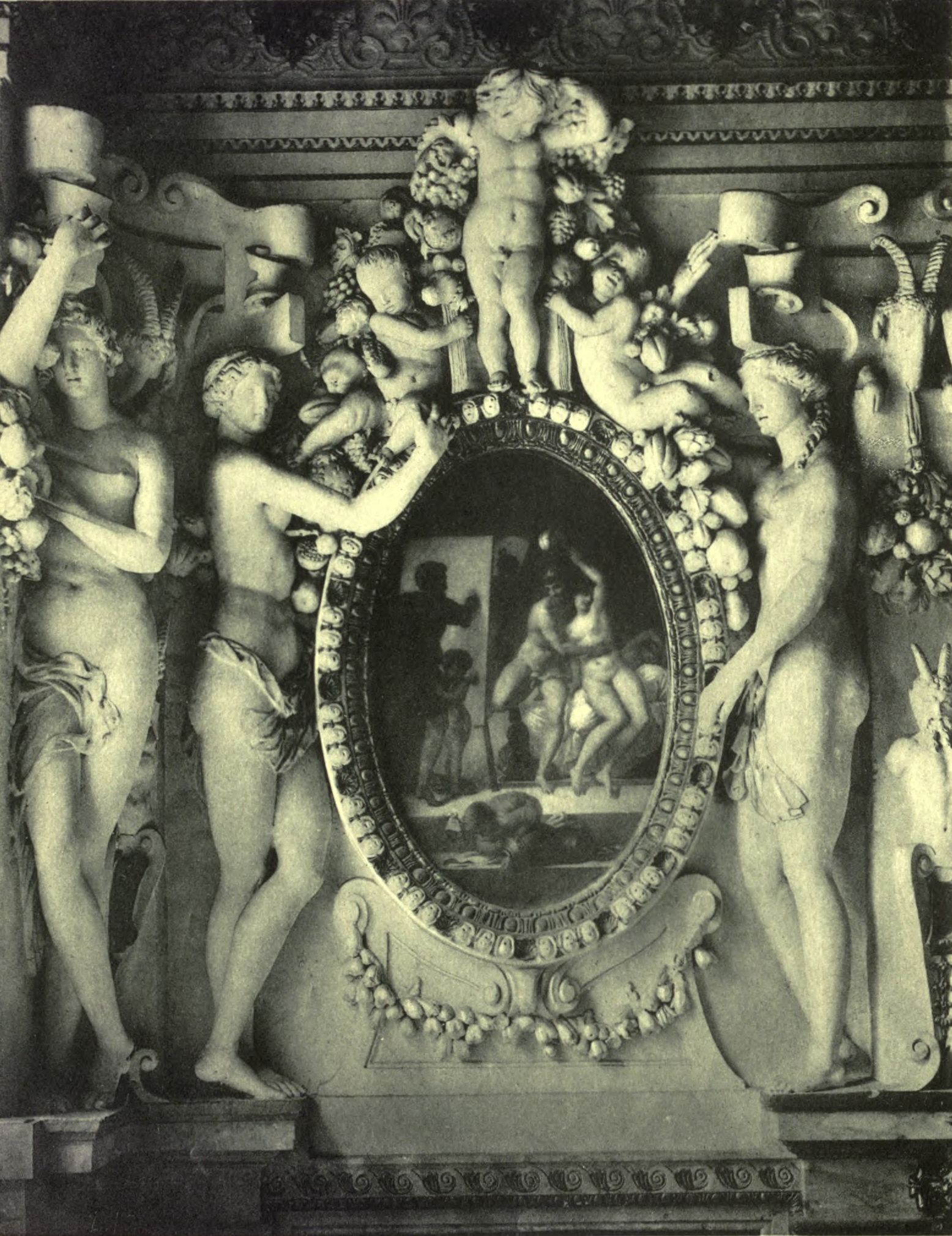 Likewise a disciple of Jacopo was Alessandro Vittoria of Trento, a most excellent sculptor and much the friend of study, who with a very beautiful manner has shown in many works that he has executed, as well in stucco as in marble, that he has a ready brain and a lovely style, and that his labours are worthy to be held in estimation. By the hand of this Alessandro, in Venice, at the principal door of the Library of S. Marco, are two great women of stone, each ten palms high, which are [Pg 205] full of grace and beauty and worthy to be much extolled. He has made four figures for the tomb of the Contarini in the Santo of Padua, two slaves, or rather, captives, with a Fame and a Thetis, all of stone; and an Angel ten feet high, a very beautiful statue, which has been placed upon the Campanile of the Duomo in Verona. And to Dalmatia he sent four Apostles also of stone, each five feet high, for the Cathedral of Traù. He made, also, some figures in silver for the Scuola of S. Giovanni Evangelista in Venice, which were all in full-relief and rich in grace, and a S. Teodoro of two feet in silver, in the round. For the Chapel of the Grimani, in S. Sebastiano, he wrought two figures in marble, each three feet high; and then he made a Pietà, with two figures of stone, held to be good, which are at S. Salvadore in Venice. He made a Mercury, held to be a good figure, for the pulpit of the Palazzo di S. Marco, which looks out over the Piazza; and for S. Francesco della Vigna he made three figures large as life—S. Anthony, S. Sebastian, and S. Rocco—all of stone and full of beauty and grace, and well wrought. For the Church of the Crocicchieri he made in stucco two figures each six feet high, very beautiful, which are placed on the high-altar; and of the same material he made, as has been already told, all the ornaments that are in the vaulting of the new staircase of the Palazzo di S. Marco, with various patterns of compartments in stucco, where Battista Franco afterwards painted in the spaces the scenes, figures, and grotesques that are there. In like manner, Alessandro executed the ornaments of the staircase of the Library of S. Marco, all works of great mastery; and a chapel for the Friars Minors, and in the altar-piece of marble, which is very large and very beautiful, the Assumption of Our Lady in half-relief, with five great figures at the foot which have in them something of the grand and are made with a beautiful manner, a lovely and dignified flow of draperies, and much diligence of execution; which figures of marble—S. Jerome, S. John the Baptist, S. Peter, S. Andrew, and S. Leonardo—each six feet high, are the best of all the works that he has done up to the present. And as a crown to that chapel, on the frontispiece, are two figures likewise of marble, each eight feet high and very graceful. The same Vittoria has executed many portraits in marble and most beautiful heads, [Pg 206] which are good likenesses, such as that of Signor Giovan Battista Feredo, placed in the Church of S. Stefano, that of Camillo Trevisano, the orator, placed in the Church of SS. Giovanni e Polo; the most illustrious Marc'Antonio Grimani, likewise placed in the Church of S. Sebastiano; and in S. Gimignano, the rector of that church. He has also portrayed Messer Andrea Loredano. M. Priano da Lagie, and two brothers of the Pellegrini family—M. Vincenzio and M. Giovan Battista—both orators. And since Vittoria is young and a willing worker, talented, amiable, desirous of acquiring name and fame, and, lastly, very gentle, we may believe that if he lives, we are destined to see most beautiful works come from him from day to day, worthy of his name of Vittoria, and that, if his life endures, he is like to be a most excellent sculptor and to win the palm from all the others of that country.