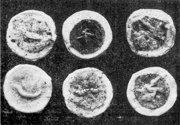 Fig. 5.—Different Kinds of Bacteria Growing in Gelatin.These culture methods are of essential importance in[Pg 26] bacteriology, as it is the only way in which it is possible to secure a quantity of germs in a pure state.