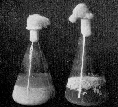 All kinds of materials may be sterilized by treatment with steam under pressure. An exposure for a few moments at 250° F., a temperature attained with 15 pounds steam pressure, will destroy all kinds of bacteria and their spores. This method of sterilization is used in the canning of meats and vegetables and in the preparation of evaporated milk. To avoid contamination of the media after sterilization, the flasks and tubes are, after being filled, stoppered with plugs of cotton-wool, which effectually filter out all bacteria and mold spores from the air, and yet allow the air to pass freely in and out of the containers.