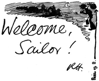 Tea came, and I was mildly puzzled again, when the steward’s assistant asked me to choose between a bloater, cold meat, and so on. I was deciding on something slenderer, when I realized that tea included supper, and applied for a kipper. The captain’s wife kept conversation alive. The topic, I remember, was the lamented custom which once permitted captains’ wives to make “the round trip” with their husbands.