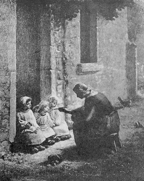 Millet's mother worked in the fields with his father all day long. So it was his grandmother who rocked him to sleep and cared for him while he was very little. She was the one who named him Jean after his father, and François after the good St. Francis. She was a religious woman, and almost the only pictures Millet saw when he was a boy were those in his grandmother's Bible. He copied them many times, [Pg 8] drawing them with white chalk on the stone wall. This pleased the grandmother very much, and she encouraged him all she could.