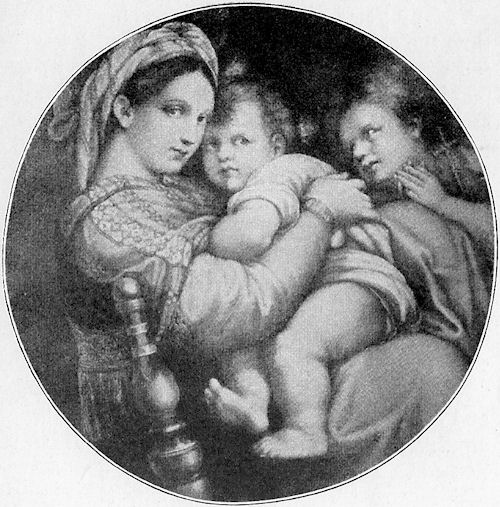 The mother's face was so good and kind, and she looked so lovely there on the porch with her children, that she reminded Raphael of that other mother, Mary, the mother of the baby Jesus. The elder brother looked like the little St. John adoring Jesus. So Raphael painted a halo around their heads and called the picture the "Madonna of the Chair." This halo is a ring of light which artists often paint around the heads of angels and saints. Raphael wanted to make us think loving and tender thoughts about the baby Jesus, Mary, and St. John.