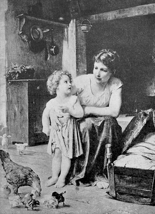 When the artist, Mrs. Elizabeth Gardner Bouguereau, visited this home and saw the mother and her child watching this old hen and her chickens, it is no wonder she wanted to paint them. She wanted to make us feel the love of the mother hen for her little ones as well as that of the other mother for her children.