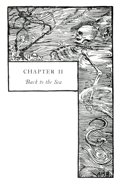 But in perfect calm the scene is changed. Veiled in translucent mists, the tower rises aloft[Pg 4] in grand repose beneath the hot, unclouded summer sky. Towards the summit it shows a great semi-circular gap like a mighty mouth petrified in the act of making an imprecation—a mouth gaping wide as if to salute the sea, or hail yonder craft that glides along the horizon. At ebb-tide, too, the great rock's hidden companions, the sunken reefs, begin to show themselves all around. Among them, half sunk in the sand, are seen the shattered remains of masts, rusty anchors and guns, all overgrown with seaweed and shell-fish. Here and there the eye perceives a human skull still encased in a helmet, a skeleton still protected by a shirt of mail, and innumerable remnants of stranded ships with their inscriptions and marks still readable. At one spot is seen the bottom of a vessel, whose copper plates, now hidden, now disclosed, by the restless motion of the waves, are green with verdigris. And everywhere the great sea-spiders and monster crabs—lords of the abyss—crawl and gloat unceasingly among the wreckage. Then the spectator, shuddering[Pg 5] at this terrible arrangement of still life, is forced to ask himself, "Who could have been so mad as to build a tower like this on such an accursed spot, and who the madmen that could steer their vessels hither on these cruel rocks?"