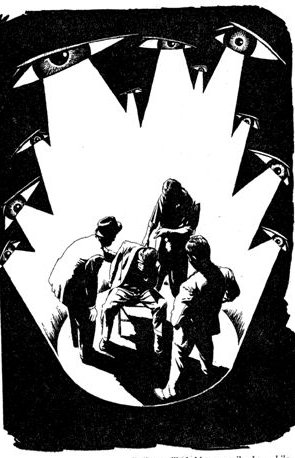 Wordless, the young man obeyed. Sitting, he seemed as stiff and uncompromising as before. The man who had spoken made a vague gesture and the overhead light went out, replaced simultaneously by strong rays from a spotlight aimed full at the eyes of the seated figure. Involuntarily the young man's head turned aside to avoid the searing brilliance, but a hand came out of the wall of darkness and jerked it back again.
