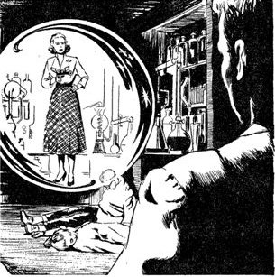 The young man's hands were shaking again. He sucked at his cigarette and let the smoke come out with his words: "She was clear over on the other side of the lab ... standing a good two feet off the floor in the middle of a big blue ball of some kind of—of soft fire. Blue fire that sort of pulsed—you know. Anyway, there she was: this hell of a good-looking blonde; looking right smack at me, and there was this funny kind of gun in her hand. She aimed it and I ducked just as this dim flash of light came out of it. Something hit me on the side of the head and I ... well, I guess I blanked out."