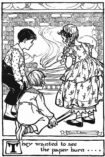 "Now I am mounting straight up to the sun," said a voice in the flames; and it was as if a thousand voices echoed the words as the flames[11] darted up through the chimney and went out at the top. Then a number of tiny beings, as many as the flowers on the flax had been, and invisible to mortal eyes, floated above the children. They were even lighter and more delicate than the blue flowers from which they were born; and as the flames died out and nothing remained of the paper but black ashes, these little beings danced upon it, and wherever they touched it, bright red sparks appeared.